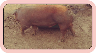 The modern Duroc pig is a medium size animal with a fairly long body.  Coloration can range from an orangy brown to a light golden to a deep mahogany red.  They characteristically have large litters that grow quickly.  They are known for deep bodies, broad hams and shoulders with high levels of tenderness.  They survive well in both cold and hot climates.  They have a relatively calm temperment, but can be tenacious when caring for a litter.